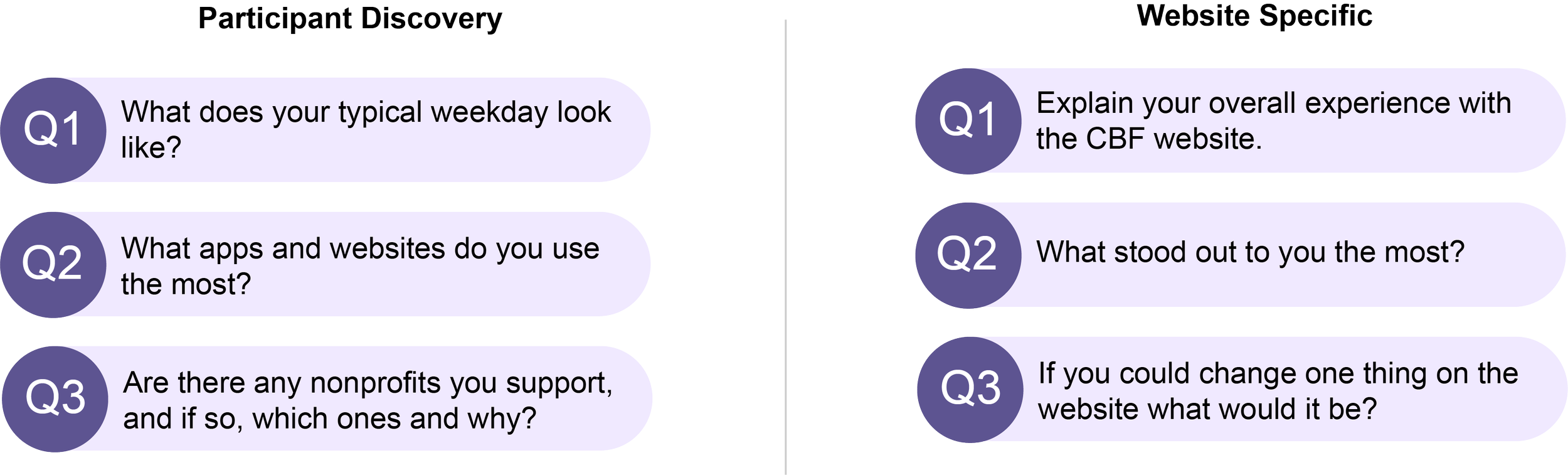 I interviewed 15 people as they clicked through the CBF website for 5 minutes. Afterwards, I asked them questions regarding their experience. Despite a small group, I worked to reduce bias by including both males and females, ranging from ages 16 to 62. I asked three discovery questions in order to get a better understanding of what the participants expect from websites and nonprofits to better educate my data. I then asked three open ended questions directly regarding the Clothed by Faith website.